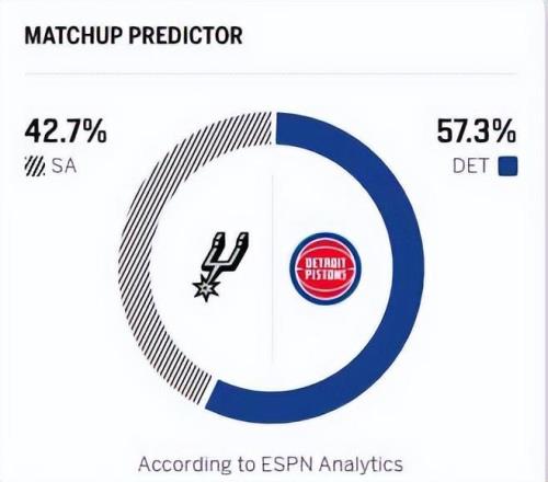 反觀馬刺,近期的狀態(tài)火熱,憑借一波8連勝,拿到40勝16負(fù)的戰(zhàn)績(jī),位居西部第二,與雷霆的差距只有3個(gè)勝場(chǎng),并甩開(kāi)身后的掘金5個(gè)勝場(chǎng)差。馬刺隊(duì)過(guò)去兩場(chǎng)主場(chǎng)比賽分別擊敗太陽(yáng)和國(guó)王,延續(xù)了連勝勢(shì)頭。上一場(chǎng)對(duì)陣國(guó)王,馬刺以139比122兵不血刃取勝,核心文班亞馬延續(xù)無(wú)解表現(xiàn),拿下28分15個(gè)籃板6次助攻的全面數(shù)據(jù),帶領(lǐng)球隊(duì)多點(diǎn)開(kāi)花、輕松取勝。此役,活塞的杜倫與內(nèi)線怪物文班亞馬的較量,無(wú)疑看點(diǎn)十足。賽前,美媒ESPN預(yù)測(cè)本場(chǎng)比賽,馬刺取勝的概率為42.7%,活塞勝率57.3%。