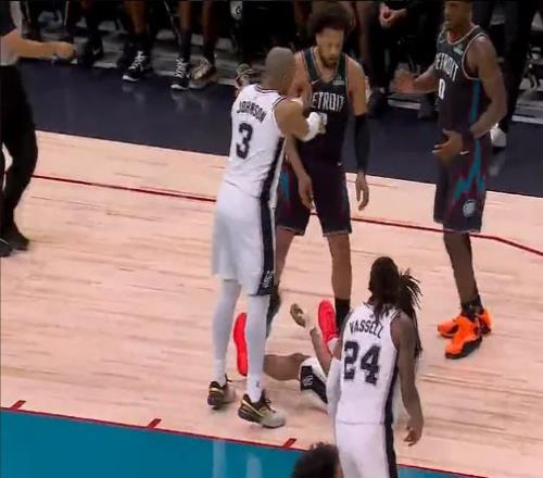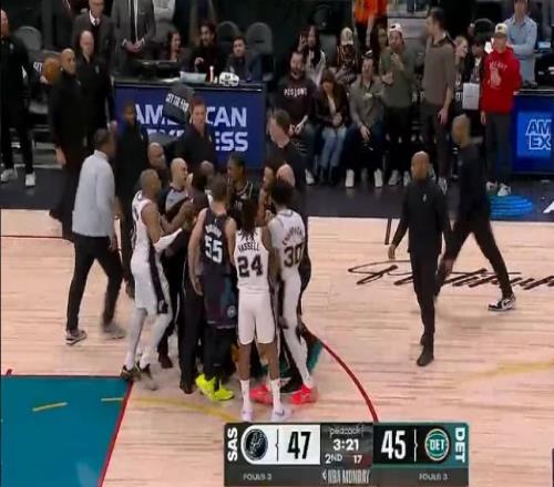 次節比賽,馬刺進攻火力升級本場首次單節得分30+,且限制活塞連續兩節單節不足30分。馬刺追到29-29,活塞一波6-0攻勢取得領先,馬刺連中三分一波9-0攻勢奪回領先。馬刺繼續維持47-45領先,坎寧安推倒卡斯爾引發沖突,凱爾登推搡坎寧安,杜倫手指凱爾登,裁判吹罰凱爾登與杜倫技術犯規。活塞一波6-1攻勢反超3分,馬刺回敬9-4攻勢,馬刺單節33-28凈勝5分,上半場結束馬刺57-55反超活塞。前兩節比賽,馬刺三分22中11,瓦塞爾5記三分18分與尚帕尼4記三分12分,文班亞馬9中2得到7+7;活塞三分18中5,坎寧安10+3+6與霍蘭11+6。