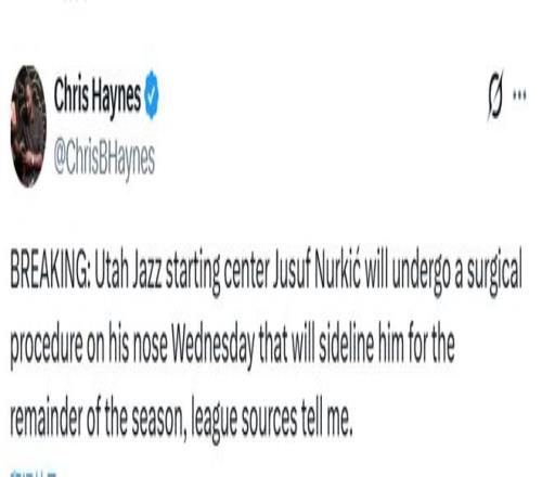 北京時間2月24日,據名記Haynes報道,猶他爵士隊中鋒努爾基奇將于明日接受鼻子手術,賽季報銷。努爾基奇幾年前鼻子骨折后,一直飽受呼吸和睡眠問題的困擾。