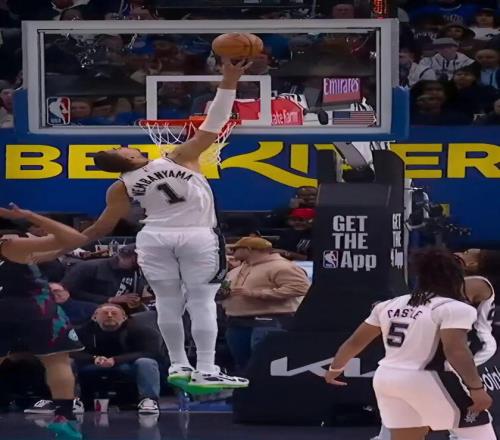 杜倫這身體素質也是夠橫的,趁著文班亞馬轉身不及,直接來了個殺人誅心的霸氣隔扣2+1!