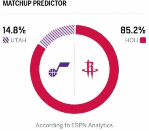 反觀爵士,目前戰績為18勝39負,本賽季爵士隊完成重磅交易,為補強防守實力引進了前最佳防守球員小賈倫·杰克遜,加之本賽季狀態爆發的基昂特·喬治,球隊未來潛力不容小覷。但目前爵士隊遭遇嚴重傷病困擾,四大主力缺陣,陣容殘缺的他們在本賽季更多是想鍛煉隊伍,擺爛俯沖狀元簽,此役戰意不足!賽前,ESPN預測這場比賽,火箭贏球概率高達85.2%,爵士贏球概率只有14.8%。