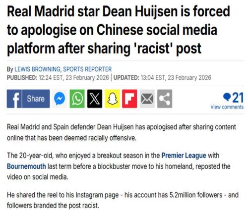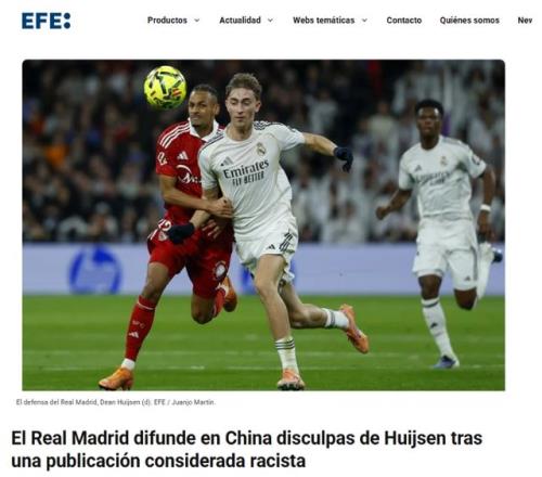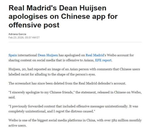 此外,西班牙COPE電臺、《阿斯報》、《世界體育報》等媒體,也都關注赫伊森辱華事件,沙特媒體OKAZ也跟進報道。不過,皇馬官方、赫伊森本人,都沒有在全球平臺發聲道歉。