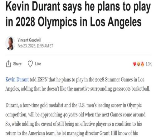 并且杜蘭特完全沒有老邁與下滑的勢頭,在接受ESPN記者Vincent Goodwill采訪時更是公開表示自己計劃參加2028年的洛杉磯奧運會。