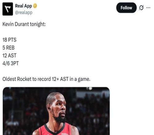值得一提的是,12次助攻不僅是杜蘭特火箭生涯新高,37歲147天的杜蘭特也成為火箭隊史單場送出至少12次助攻年齡最大的球員。