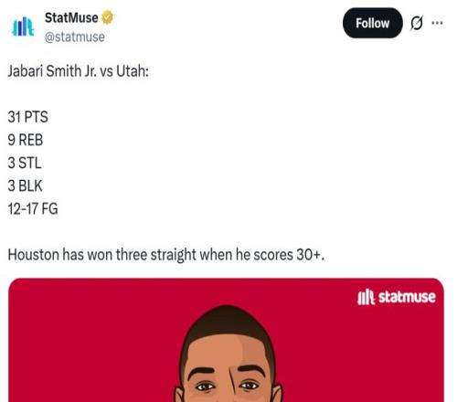 對于嚴重缺乏投射威脅的火箭隊來說,小賈已經成為球隊贏球風向標,本賽季當他拿下30+得分表現時火箭隊3勝0負保持不敗。