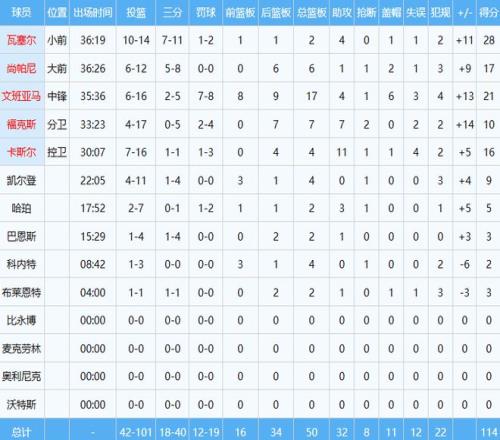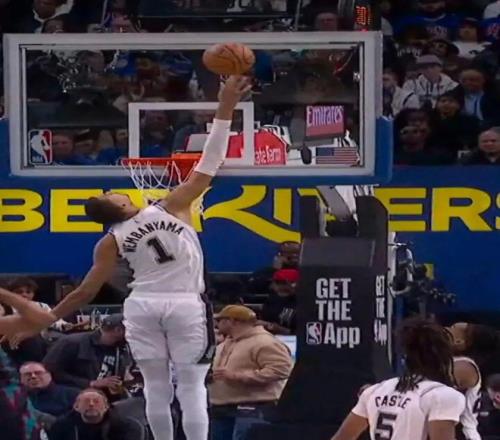 文班亞馬(23屆狀元)防守端影響力巨大,屢次讓21屆狀元坎寧安吃癟,后者全場出手26次僅中5球得到16分6板10助2斷3帽,正負值-18全隊最低。