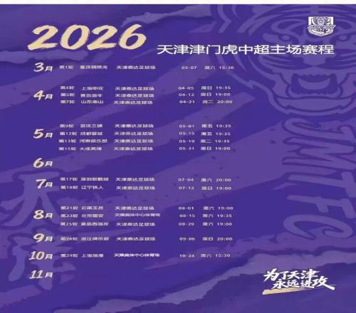 2026相聚泰達(dá)足球場!為津門虎吶喊助威 天津經(jīng)開區(qū)一泰達(dá) 2026-02-24 19:13:44 新賽季,新征程天津津虎隊2026賽季中超聯(lián)賽主場賽程正式出爐其中,13場于泰達(dá)足球場舉辦讓我們相聚泰達(dá)為津門虎搖旗吶喊共赴綠茵之約!信息來源:泰達(dá)足球場中超免費(fèi)觀看_津門虎免費(fèi)觀看_中超聯(lián)賽免費(fèi)觀看_中超高清在線_津門虎高清在線_中超聯(lián)賽高清在線 中超 津門虎 中超聯(lián)賽 泰達(dá)足球場 上一篇: 官方:國安簽下馬里中場孔特,外援引進(jìn)工作收官 下一篇: 31,大連英博熱身賽完勝廣西,馬萊萊2場3球狀態(tài)火熱馮勁已到隊
