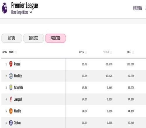 Opta超級計算機的模型也計算了各隊進入“英超前四”的概率。盡管阿斯頓維拉近期狀態有所下滑,但由于前期積累的優勢,他們仍有85.7%的高概率進入前四;利物浦的概率為47.1%,而曼聯緊隨其后,概率為 44.1%。