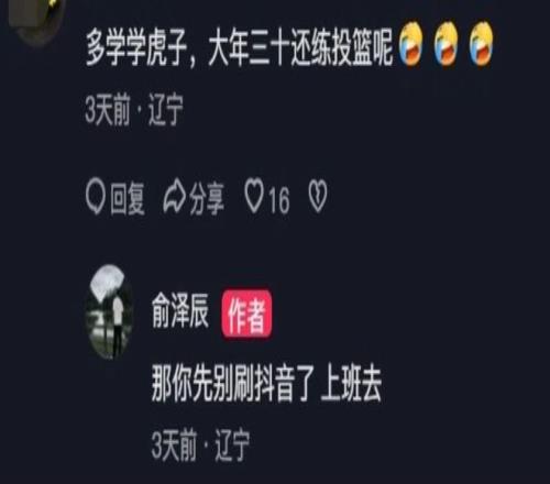 遼寧男籃本賽季的表現(xiàn)比較糟糕,主要是國內(nèi)球員出現(xiàn)了斷檔的情況,外援選擇方面也不給力。在春節(jié)假期期間,不少球員都選擇了休息和放松,不過也有球員沒有松懈,而是在繼續(xù)提升自己。比如李虎翼,他甚至在除夕那天還在自己加練。有球迷看到俞澤辰23日發(fā)布的自己的騎馬視頻后,在下面留言,表示讓他學(xué)學(xué)虎子,大年三十還在練投籃呢。對此俞澤辰直接懟了回去,表示該球迷先別刷視頻了,該上班去。兩人的這一問一答引發(fā)了球迷熱議。