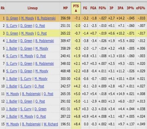 在勇士三人組中,追夢、波杰、穆迪的組合一起出戰將近357分鐘,這一時長排名隊內第四(前三的三人組中至少有庫里和巴特勒其中一人),但三人同時在場時,勇士每百回合要凈負7.1分,在隊內斷層式墊底。