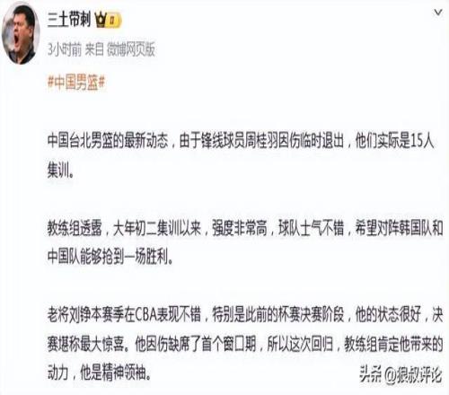 北京時(shí)間2月24日,根據(jù)中國(guó)臺(tái)北媒體的報(bào)道,鋒線球員周桂羽因傷臨時(shí)退出,只有15人參加了集訓(xùn)。