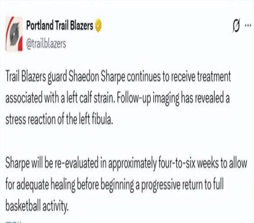 北京時間2月25日,開拓者官方更新傷病報告,后衛謝登-夏普仍在接受左側小腿拉傷的相關治療。復查影像顯示,他出現了左側腓骨應力性反應。夏普將在約4–6周后接受重新評估,以確保傷勢充分愈合,之后再逐步恢復完整的籃球訓練與比賽。