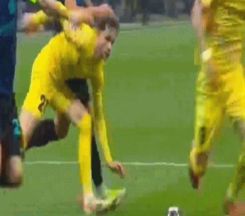 第44分鐘,巴雷拉禁區右側突破,在卡斯帕-霍放鏟的情況下痛苦倒地,但裁判示意后者鏟到球。