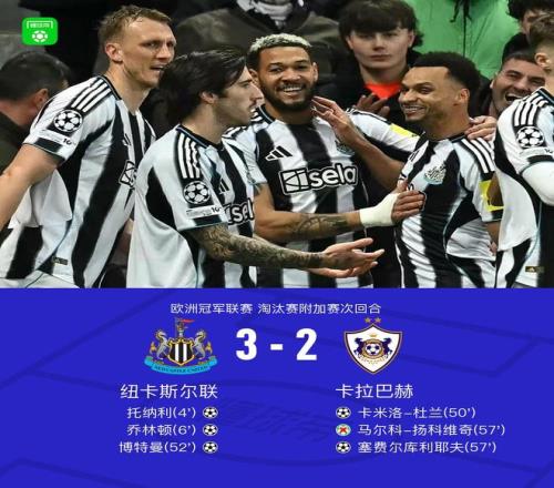 北京時(shí)間2月25日歐洲冠軍聯(lián)賽 淘汰賽附加賽次回合,紐卡斯?fàn)柭?lián)對(duì)陣卡拉巴赫。紐卡斯?fàn)柭?lián)托納利破門,喬林頓破門,博特曼破門。卡拉巴赫卡米洛-杜蘭破門,塞費(fèi)爾庫利耶夫破門。最終比分紐卡斯?fàn)柭?lián) 3-2 卡拉巴赫。兩回合總比分紐卡斯?fàn)柭?lián)9-3卡拉巴赫。