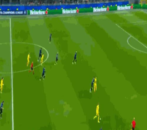第68分鐘,巴雷拉挑傳,迪馬爾科果斷前插倒三角回敲,阿坎吉不停球低射遠角卻擊中了立柱,錯過了將功補過的機會,國米兩回合下來已經擊中了3次門框。大比分落后,國米的大舉壓上給予了對手更多的反擊機會;第72分鐘,海于格右路長傳反擊,埃夫連前插到禁區停球低射一氣呵成,0:2,總比分已經來到了1:5!