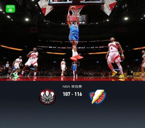 第四節(jié)猛龍奎克利拿下8分,雷霆卡森-華萊士拿下7分,最終猛龍107-116不敵雷霆