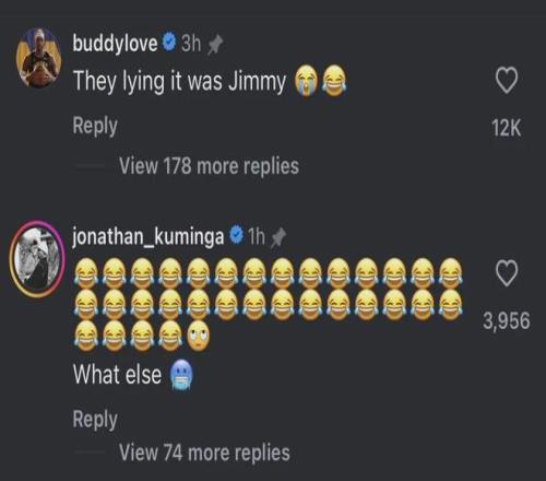 希爾德跟巴特勒私交很好,他主動替庫明加解圍:“他們在說謊,其實是巴特勒拿的!(笑哭的表情)”庫明加回復希爾德:“還有呢?再爆料點……”庫里回復庫明加:“對不起了兄弟,這新聞太離譜了!去(老鷹)成為偉大吧!”