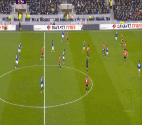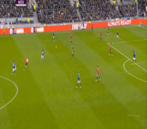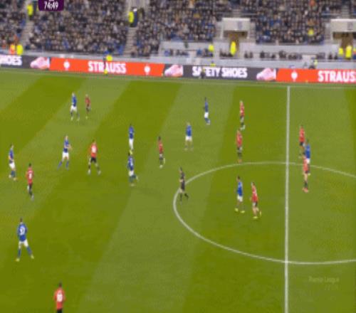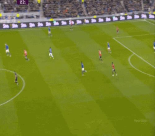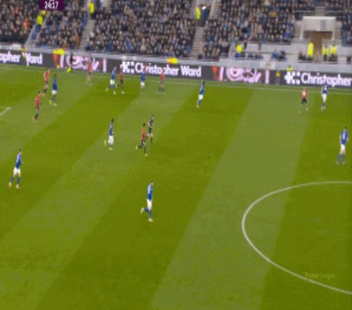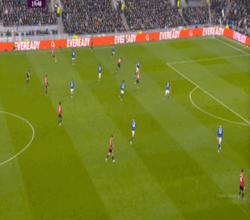 本場比賽的他,的確出現了很多問題,但在兩線之間出現問題的球員,遠不止布魯諾自己,而這個時候,你就要看到埃弗頓這個對手的特殊之處,因為在中場區域,莫耶斯直接擺出了格耶和伊洛布格南兩名黑人后腰。
