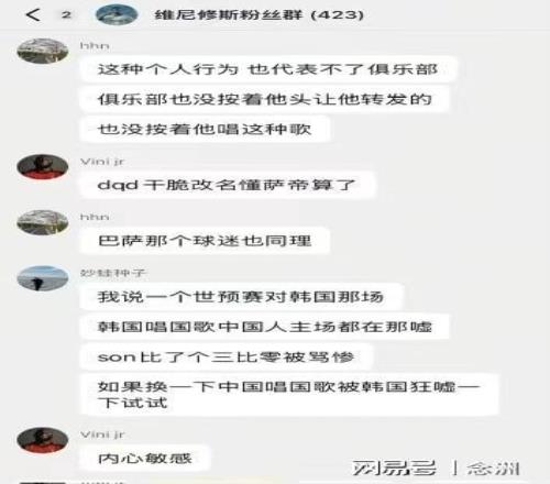 據(jù)網(wǎng)友爆料,在國(guó)內(nèi)的一個(gè)423人的維尼修斯粉絲群里面,某球迷表示:“我至今都不知道這些人叫喚什么,發(fā)個(gè)圖片咋了?赫伊森說(shuō)啥了?那個(gè)人不是中國(guó)人?趕緊把他開(kāi)除國(guó)籍吧。”