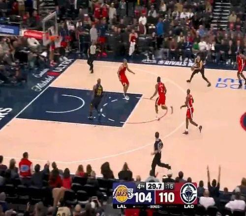 他卻把球傳給了左側45°的老詹,在2.8秒的情況下老詹只能倉促出手。
