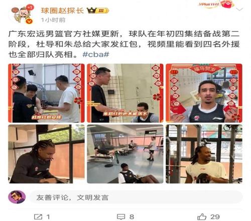 廣東宏遠俱樂部官方發布球隊集結動態,大年初四集結備戰第二階段,杜鋒和朱芳雨給大家發紅包,薩林杰、奎因、麥考爾全部歸隊!