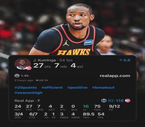 迎來老鷹生涯首秀的庫明加表現十分搶眼,替補出戰約24分鐘,投籃12中9,其中三分4中3,罰球7中6無比高效砍下27分外加7板4助2斷全面數據,正負值+16,幫助新東家119-98輕松擊敗奇才。