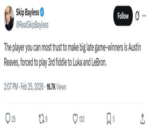 面對(duì)東契奇空位甩鍋,詹姆斯絕殺未中如此離譜的操作,名嘴Skip吐槽道:“湖人最值得信賴的末節(jié)關(guān)鍵先生是里夫斯,結(jié)果他卻只能排在盧卡與詹姆斯之后,屈居球隊(duì)第三人。”