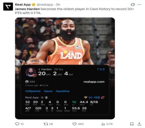 這場比賽哈登全場比賽32分鐘,18中8,三分7中4,拿到20分4助攻2籃板3失誤,命中率44.4%,三分命中率57.1%,真實命中率55.6%,正負值+10。