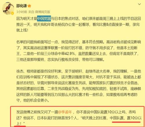 但是,籃球專業人士邵化謙和季孟年,卻都非常看好中國男籃能夠在客場贏下比賽。并且他倆認為,中國男籃不僅要贏不可一世的日本男籃,而且還要贏得比較漂亮,至少能贏對手10分以上。