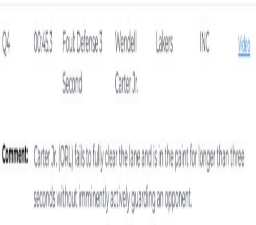 第二次漏判發(fā)生在距離比賽結(jié)束還有45.3秒,魔術(shù)的小卡特在沒(méi)有積極防守對(duì)位球員的情況下,在己方禁區(qū)停留時(shí)間超過(guò)3秒,這是一次漏吹的防守三秒違例,湖人吃虧,魔術(shù)獲利。