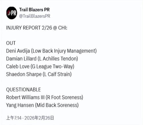 北京時間2月26日,開拓者已經召回楊瀚森,并更新了他的傷情。明日出戰公牛的狀態是出戰成疑(50%上場可能),他的傷病被標注為背部中段酸痛。此前,前方消息是他遭遇了背部拉傷。此外,羅威因右腳酸痛也被列為出戰成疑,阿夫迪亞、利拉德、樂福和夏普被列為缺陣狀態。