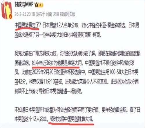 球迷也幾乎一致看衰郭士強,看衰中國男籃,他們認為中國隊會大概率不敵日本隊。然而昨天日本隊的大名單出來后,名記付政浩卻表示非常樂觀,他認為中國男籃勝算大增,甚至說中國隊贏定了。雖然他打了一個問號,實際最后下的結論是中國隊能夠戰勝日本隊。