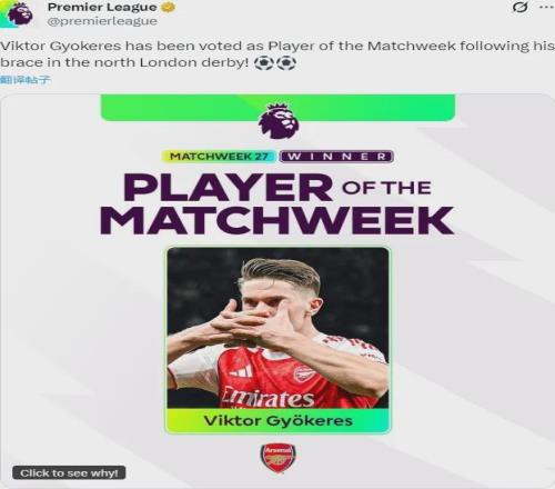英超官方:哲凱賴什被票選為了英超上周最佳球員,這名前鋒在北倫敦德比中完成了梅開二度。
