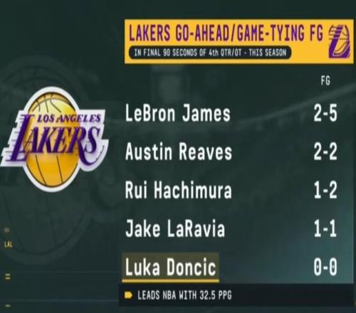 首先,本賽季第四節或加時最后90秒的扳平或反超球方面,身為NBA的得分王(場均32.5分)卻沒有一次出手。數據顯示,湖人其他球員在這個情況下的出手數據如下:詹姆斯5中2,里夫斯2中2,八村壘2中1,拉拉維亞1中1,但東契奇是0中0。