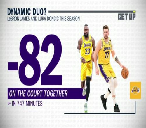 第二項數據就是東契奇和詹姆斯本賽季同場的747分鐘,湖人輸給對手82分,在全隊任何雙人組合的數據里,這是最差的。