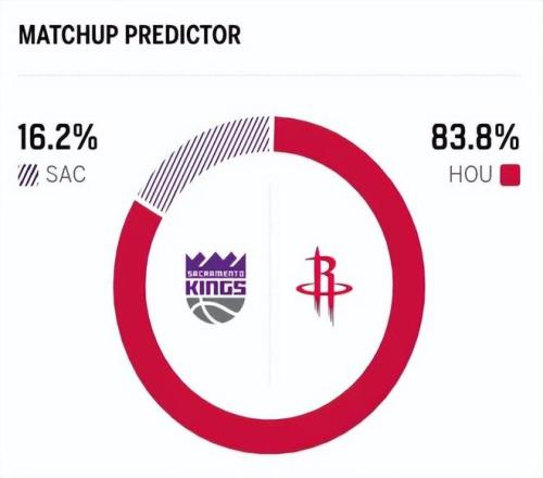 賽前,美媒ESPN對(duì)本場(chǎng)比賽進(jìn)行了勝率預(yù)測(cè),火箭隊(duì)勝率依舊高達(dá)83.8%,國(guó)王勝率則僅有16.2% ,差距明顯。