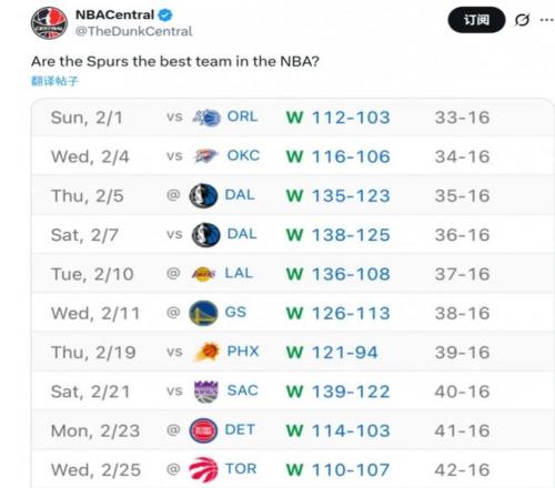 本場(chǎng)比賽,馬刺一度落后多達(dá)15分,以78-90落后12分進(jìn)入末節(jié)。但球隊(duì)?wèi){借深厚的底蘊(yùn)強(qiáng)勢(shì)反撲,末節(jié)打出32-17的懸殊攻勢(shì),單節(jié)凈勝15分,最終馬刺客場(chǎng)110-107逆轉(zhuǎn)猛龍,豪取聯(lián)盟現(xiàn)存最長(zhǎng)的10連勝。同時(shí),這也是馬刺自15-16賽季之后的第一個(gè)10連勝,那個(gè)時(shí)候他們拿到13連勝。值得一提的是,明天馬刺將對(duì)陣籃網(wǎng),這是他們二月份最后一場(chǎng)比賽,如果不爆冷,馬刺將在2月拿到11勝0負(fù)的戰(zhàn)績(jī)!賽后,美媒NBA Central曬出馬刺最近10場(chǎng)的戰(zhàn)績(jī),并發(fā)出靈魂拷問(wèn):“馬刺是聯(lián)盟最強(qiáng)球隊(duì)嗎?”
