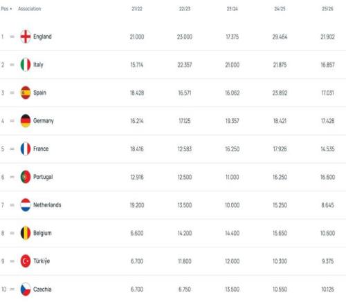 目前的歐戰(zhàn)積分中,英格蘭21.902分斷檔領先,德甲、西班牙、意大利和葡萄牙分列2-5位,法國排在第6。