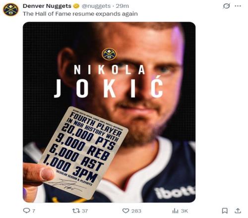 掘金官方曬出約基奇已經完成20000分+9000籃板+6000助攻+1000三分,他是歷史第四位達成這一數據的球員,前三位是皮蓬、詹姆斯、威少,當然約基奇也是唯一能達成這樣數據的中鋒球員。