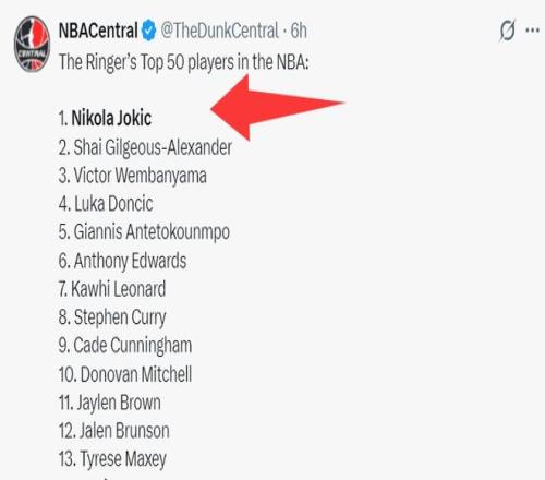 在這場比賽之前,美媒The Ringer選出了本賽季前50球星,約基奇第一、亞歷山大第二、文班亞馬第三、東契奇第四、揚尼斯第五、華子第六、倫納德第七、庫里第八、坎寧安第九、米切爾第十。