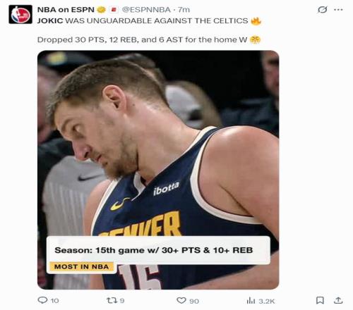 約基奇本賽季已經完成第15次30+10,就連NBA官方都盛贊約基奇在對陣綠凱的比賽中不可阻擋。(約基奇打常規賽跟打全明星的確是判若兩人)