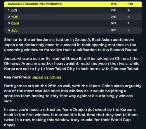 與 A 組中兩位聯席領隊的境況相似,東亞勁旅日本和韓國只需在即將到來的窗口期內的首場比賽中獲勝,即可正式獲得晉級第二輪的資格。