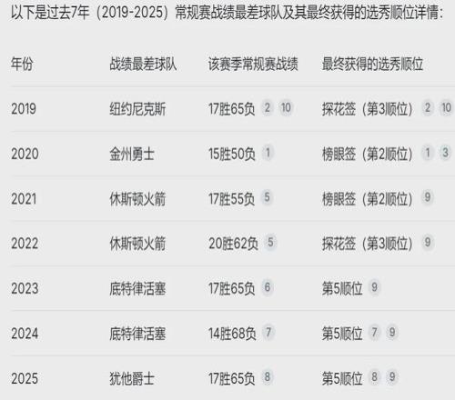 聯(lián)盟擬定的反擺爛條例當(dāng)中,比較有用的大概兩條:1、禁止同一支球隊連續(xù)兩年獲得前四順位;2、連續(xù)兩年戰(zhàn)績倒數(shù)前三的球隊,第二年樂透抽簽不能再拿高順位簽。有些球隊連續(xù)多年擺爛,以前能連續(xù)抽到高順位簽,以后不行了。