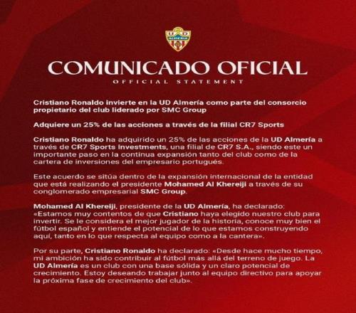 周四,C羅發表聲明表示收購西乙俱樂部阿爾梅里亞25%的股份。