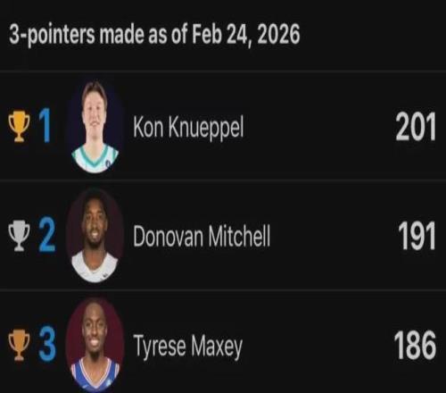 這哥們的確變態準,而且他只要再扔進6記三分球達到207記,就可以登頂NBA史上新秀三分王,22屆首輪第四號秀基根-默里(國王)曾于22-23賽季出戰80場比賽合計扔進206記三分球。