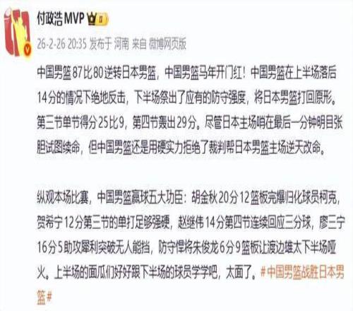 “中國男籃在日本打出了一場精彩的逆轉戰,從上半場最多落后15分,到下半場打出54-33,有點長沙亞錦賽逆轉韓國隊那味兒了。上下半場判若兩隊,關鍵在第三節首發上了廖三寧,與賀希寧一起,雙寧聯手打出良好進攻開端,14-0抹平分差。中國隊的三分球下半場進了7個,其中賀希寧、趙繼偉、高詩巖膽大手準,外線一開,由此打開了胡金秋的攻筐火力,下半場得了12分……在防守上,中國隊改善了擋拆防守,不過度防對手三分,對手后兩節也只進了3個三分……中國隊不缺拼勁,就是進攻差,想贏怕輸,防守用力過猛,犯規太多,上半場投得不好,差得甚至不敢投。下半場變換了用人,增加了“雙寧”的進攻,一順百順……最后的3罰一擲也是沒誰了……當然,困難越大越能提醒環境惡劣,祝中國隊借這一場徹底打開信心,下一戰輕松拿下臺北。”