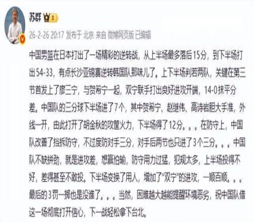 看到中國男籃取勝了,名嘴蘇群直接盛贊了起來——