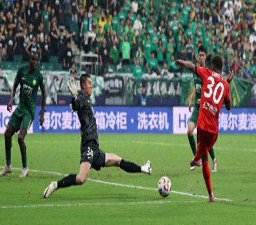 2025年9月21日,上海海港隊球員加布里埃爾(中)在比賽中進攻。 當日,在北京工人體育場舉行的2025賽季中國足球超級聯賽第25輪比賽中,北京國安隊主場2比3不敵上海海港隊。 新華社記者 胡星宇 攝