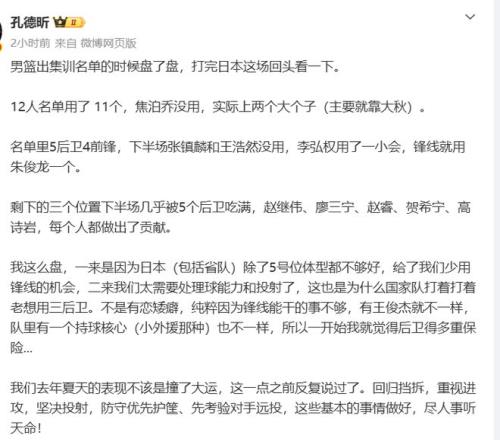 一來是日本隊除了5號位體型外都不夠好,給了我們少用鋒線的機會;二來我們太需要處理球能力和投射了,這也是為什么國家隊打著打著就老想用三號位,不是有戀矮癖,純粹是因為鋒線能干的事不夠,有王俊杰就不一樣,隊里有一個持球核心(小外援那種)也不一樣,我們?nèi)ツ晗奶斓谋憩F(xiàn)不該是撞了大運,這一點之前反復(fù)說過了。回歸擋拆,重視進攻,堅決投射,防守優(yōu)先護筐、先考驗對手遠投,這些基本的事情做好,盡人事聽天命!