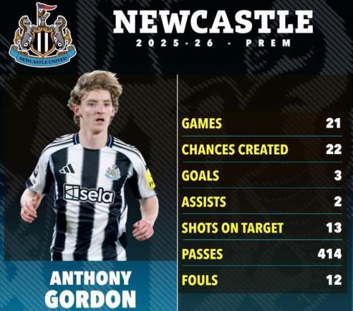 戈登身高1米83,司職左邊鋒,也能踢中鋒。2025-26賽季,戈登在英超21場貢獻3球2助,發揮起伏不定。不過在歐冠,戈登10次出場打進10球,射手榜上僅次于13球的姆巴佩。戈登也是英格蘭現役國腳,代表三獅軍團出場16次打進2球,有望出戰2026年世界杯。